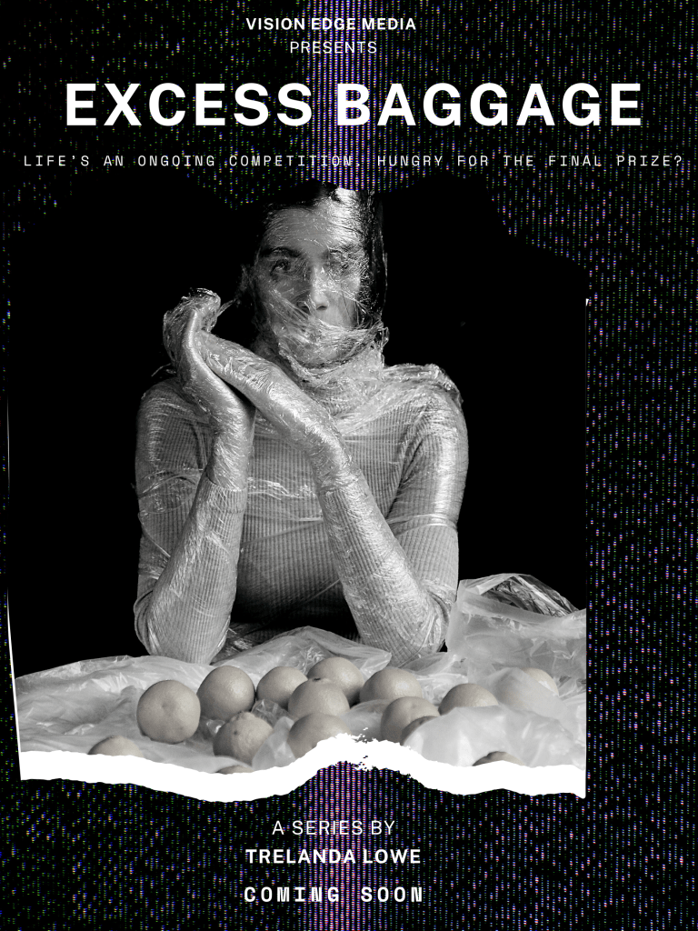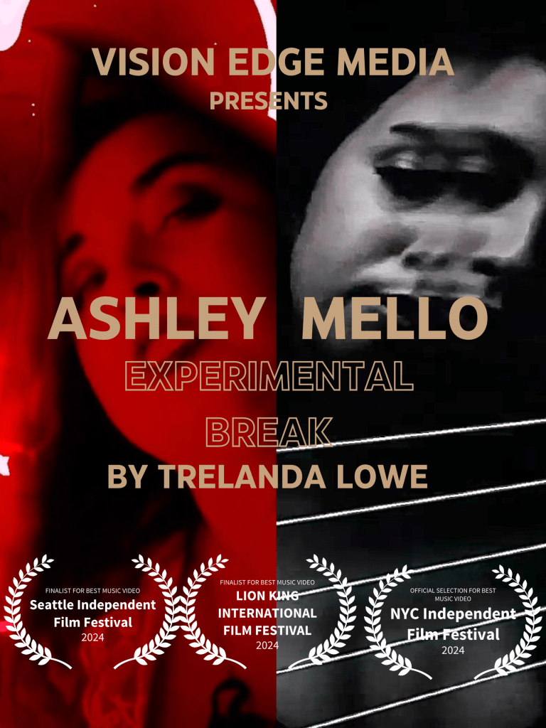 Image Description: A double image of the same woman in multiple colors. TEXT – Vision Edge Media, Presents, Ashley Mello, Experimental Break, By Trelanda Lowe. Three laurels from film festivals are displayed below.