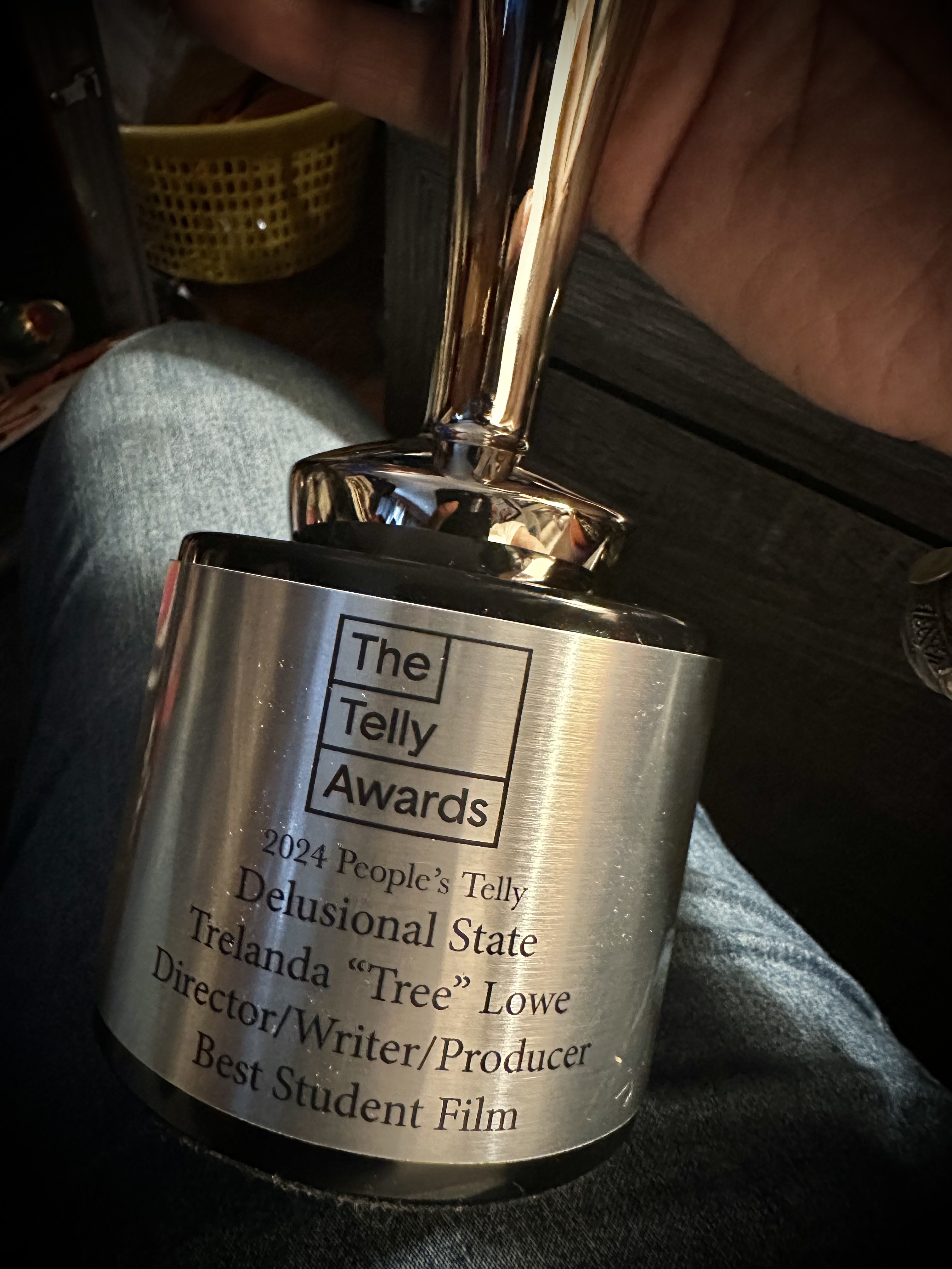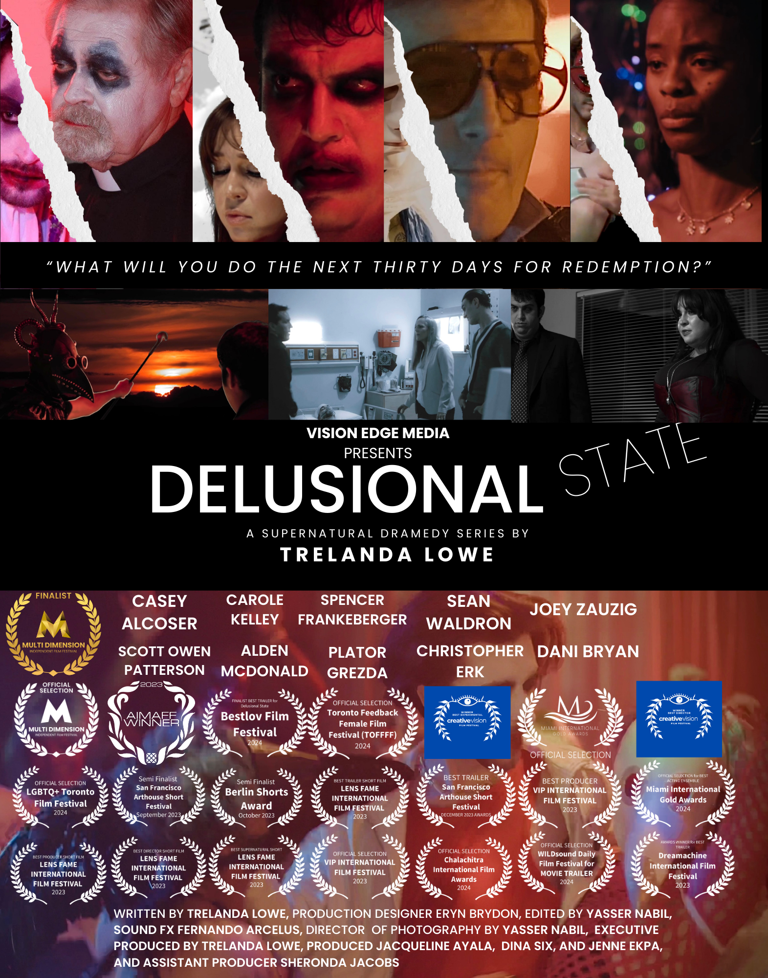 [Image Description]: Image one is a TEXT: 2022 Silver Winner The Davey’s Award (DEI) for Podcasts and Laurel wrapped around the text. Image two is a 2023 Silver Winner The Davey’s Awards (DEI) Individual Episodes for Podcasts and Laurel wrapped around the text. Image three is a TEXT: Semi-Finalist for the San Francisco Arthouse Short Festival in September 2023 and Laurel wrapped around the text. Image four is a TEXT: Semi-Finalist for the Berlin Shorts Festival in October 2023 and Laurel wrapped around the text. Image five is a TEXT: Official Selection for the Dreamachine International Film Berlin Festival in December 2023 and Laurel wrapped around the text. Image six is a TEXT: Official Selection for the LGBTQ+ Toronto Film Festival in December 2023 and Laurel wrapped around the text. (Images five and six Official Selection for Delusional State). Image seven is a TEXT: Best Trailer for the San Francisco Arthouse December 2023 Awards and Laurel wrapped around the text. Images eight through thirteen are a TEXT: (Best Trailer, Best Drama, Best Producer, Best Director, and Best Supernatural Short Film) and Laurel wrapped around the text. Image fourteen is a TEXT: Red Movie Awards – Reims Excellence Director – Winner – 2024and Laurel wrapped around the text. Image fourteen is a TEXT: Telly Award Winner, 45th Annual Telly Awards, The Telly Awards – 2024. Image fifteen is a TEXT: Women In Podcasting, 2024 Awards Nominee.