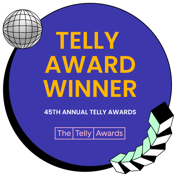 Image Description Two: An oblong silver shape appears with TEXT: Silver Winner 2024-Davey Awards.