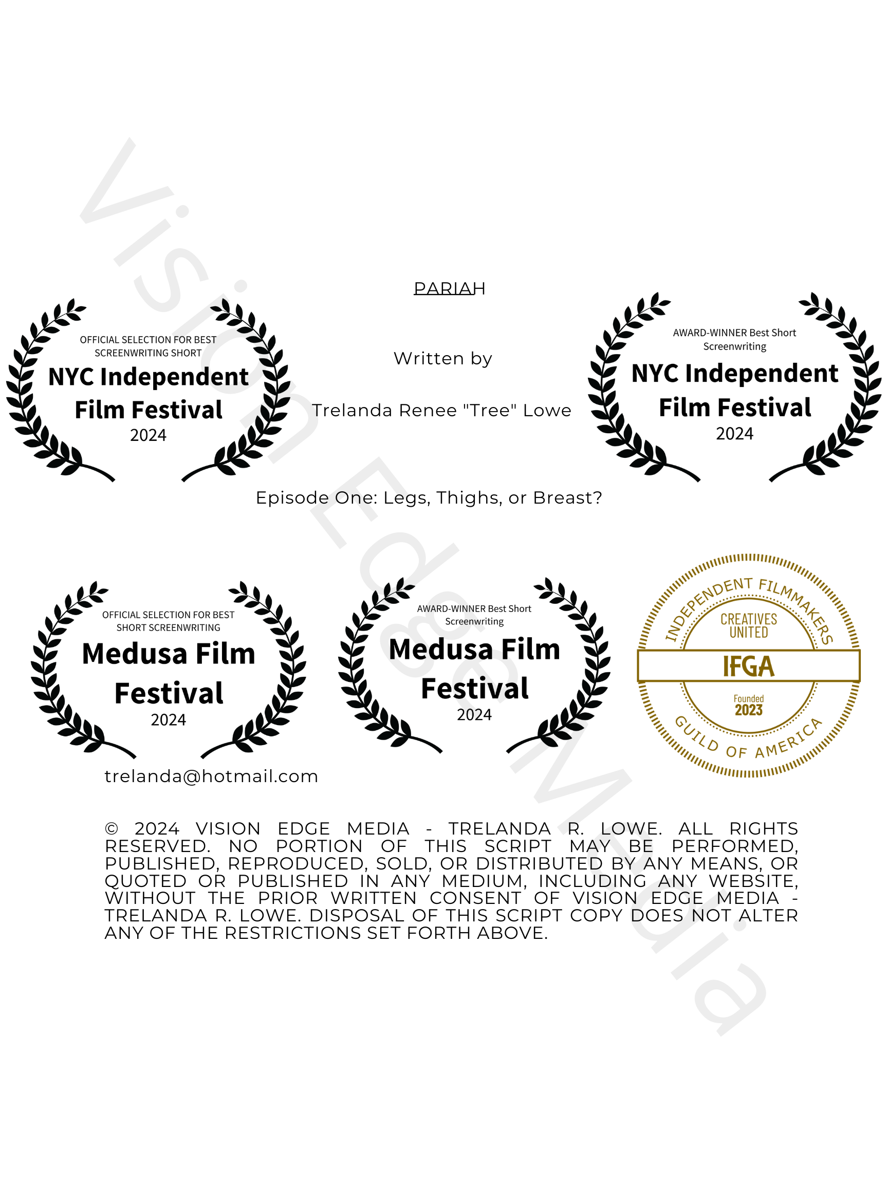 Image Description: A script with laurels all over it. TEXT reads Pariah, Written by Trelanda Renee “Tree” Lowe, Episode One: Legs, Thighs, or Breast. Image Description Two: A film poster displays of a woman’s hidden face and only one eye is exposed. TEXT reads Pariah, Written by Trelanda Renee “Tree” Lowe, and laurels are randomly at the poster’s bottom.