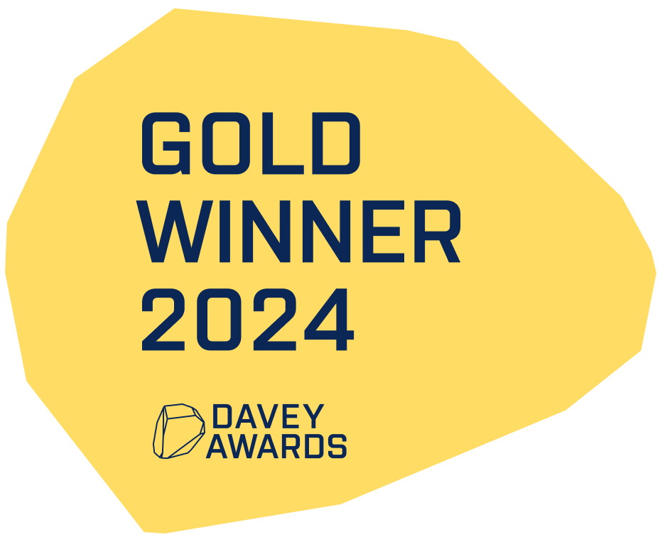 Image Description Two: An oblong gold shape appears with TEXT: Gold Winner 2024-Davey Awards.