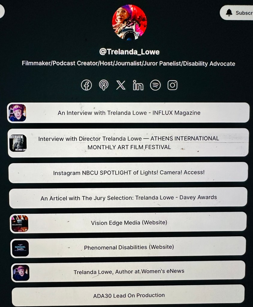 The brand was launched in 2022, reaching globally through their podcasting channel Phenomenal Disabilities with Tree Lowe that’s available on all the premium digital channels: Spotify, Amazon, Google Podcasts, iHeart, Castbox, and other streaming platforms. Trelanda’s work is recognized in Forbes, Variety, and numerous other publications.